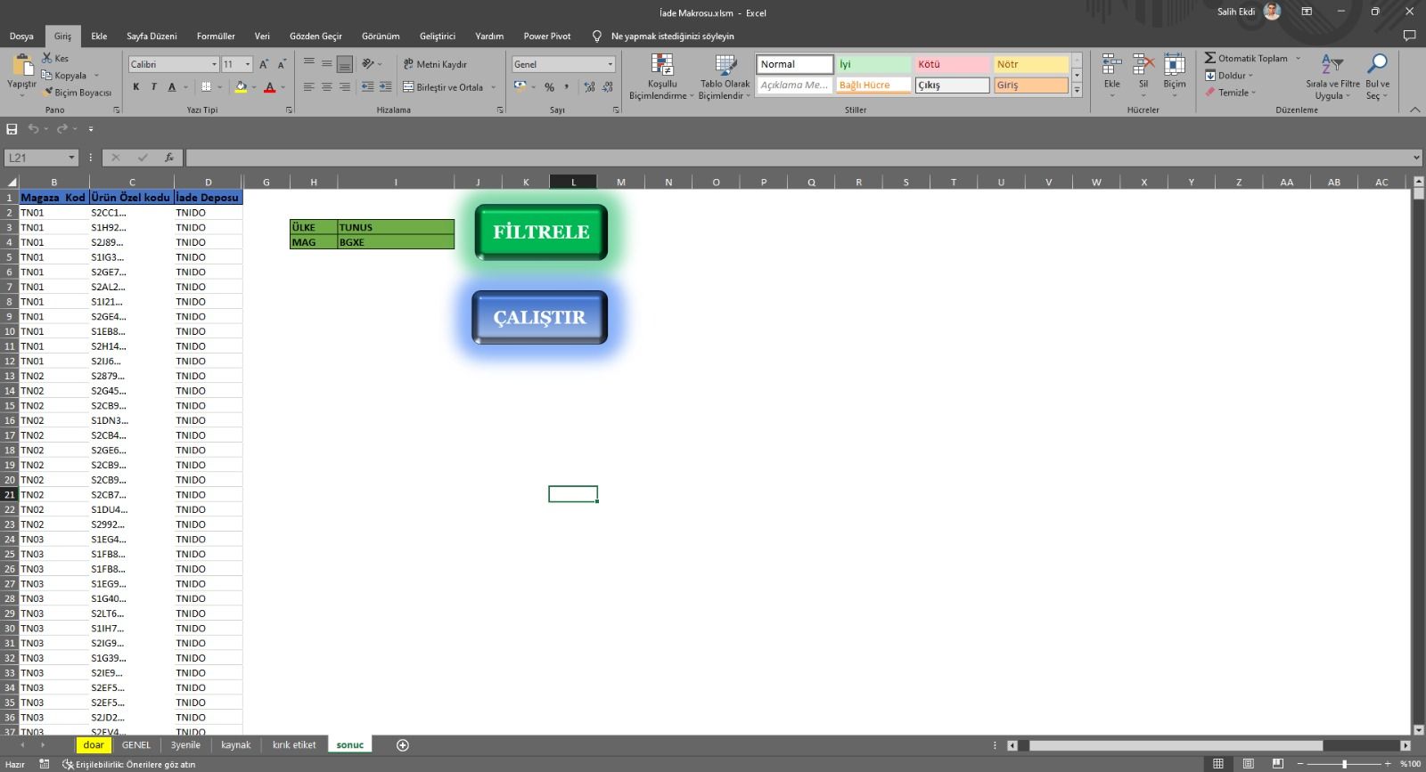 Kullanıcı analiz etmek istediği ülkeyi, markayı ve transfer yapmak istediği mağazaları seçer ve filtrele butonuna basarak ilgili verinin veri tabanından excele aktarılmasını sağlar ve aynı zamanda exceldeki geçmiş veriyi temizler.