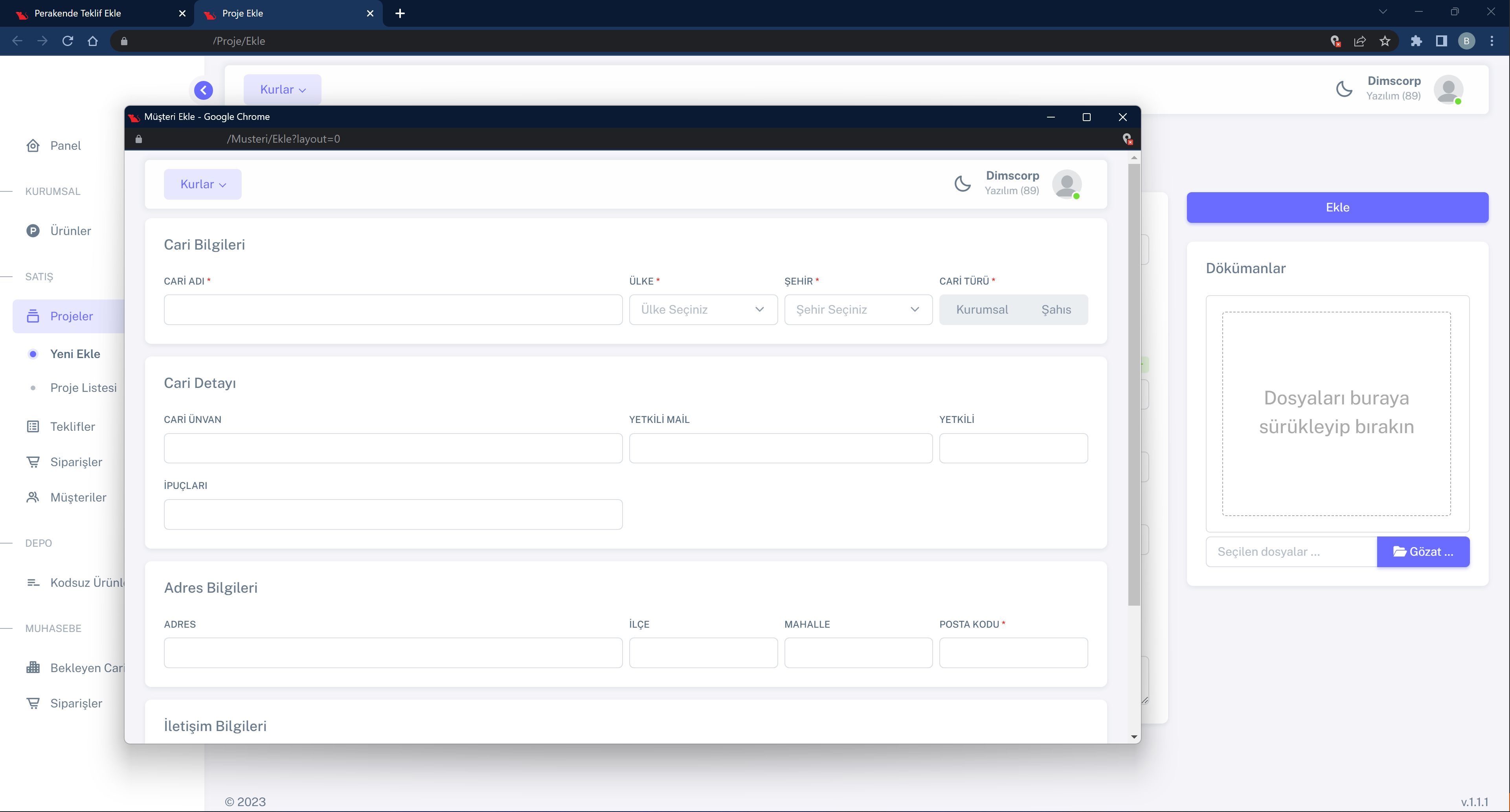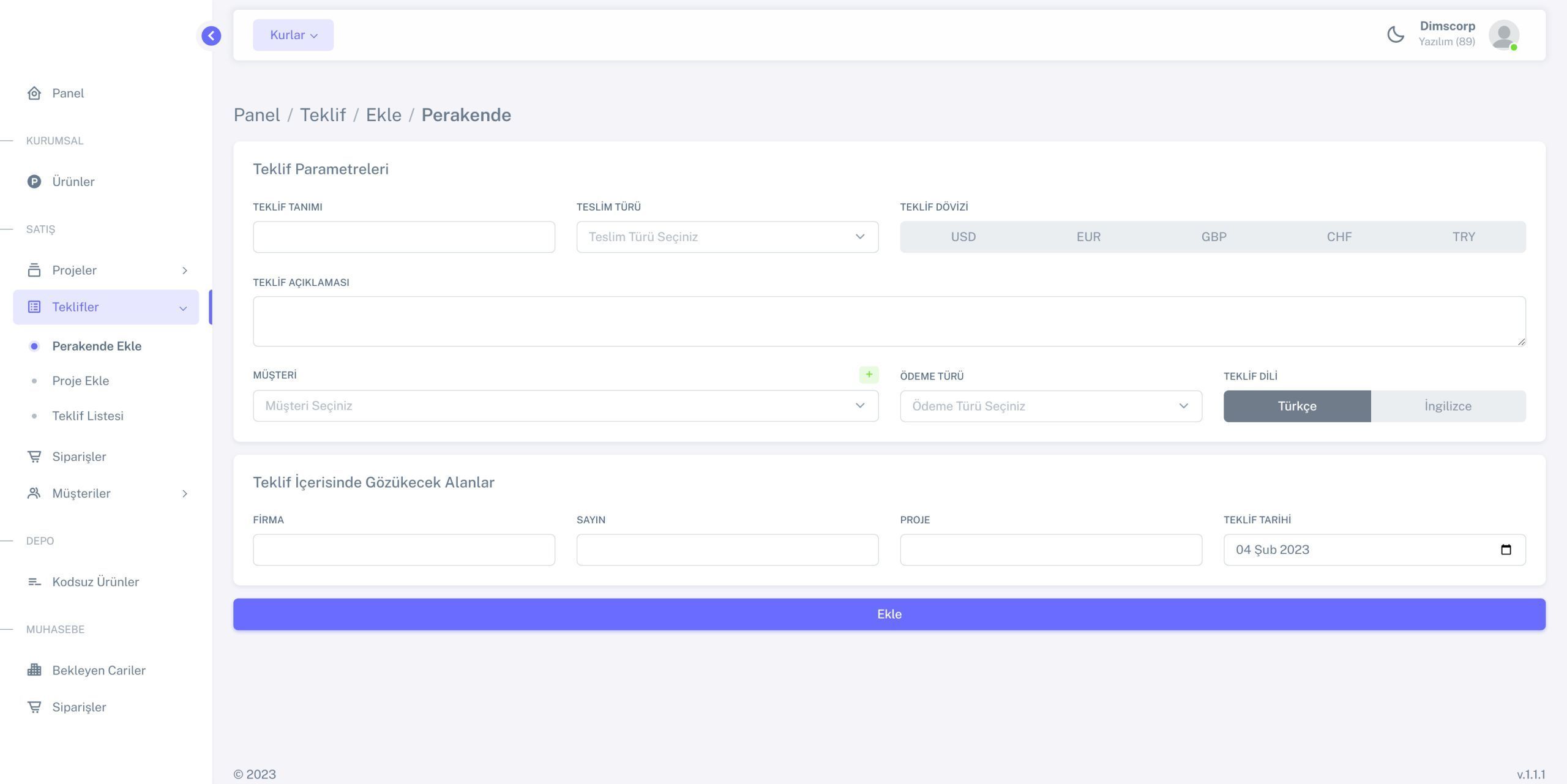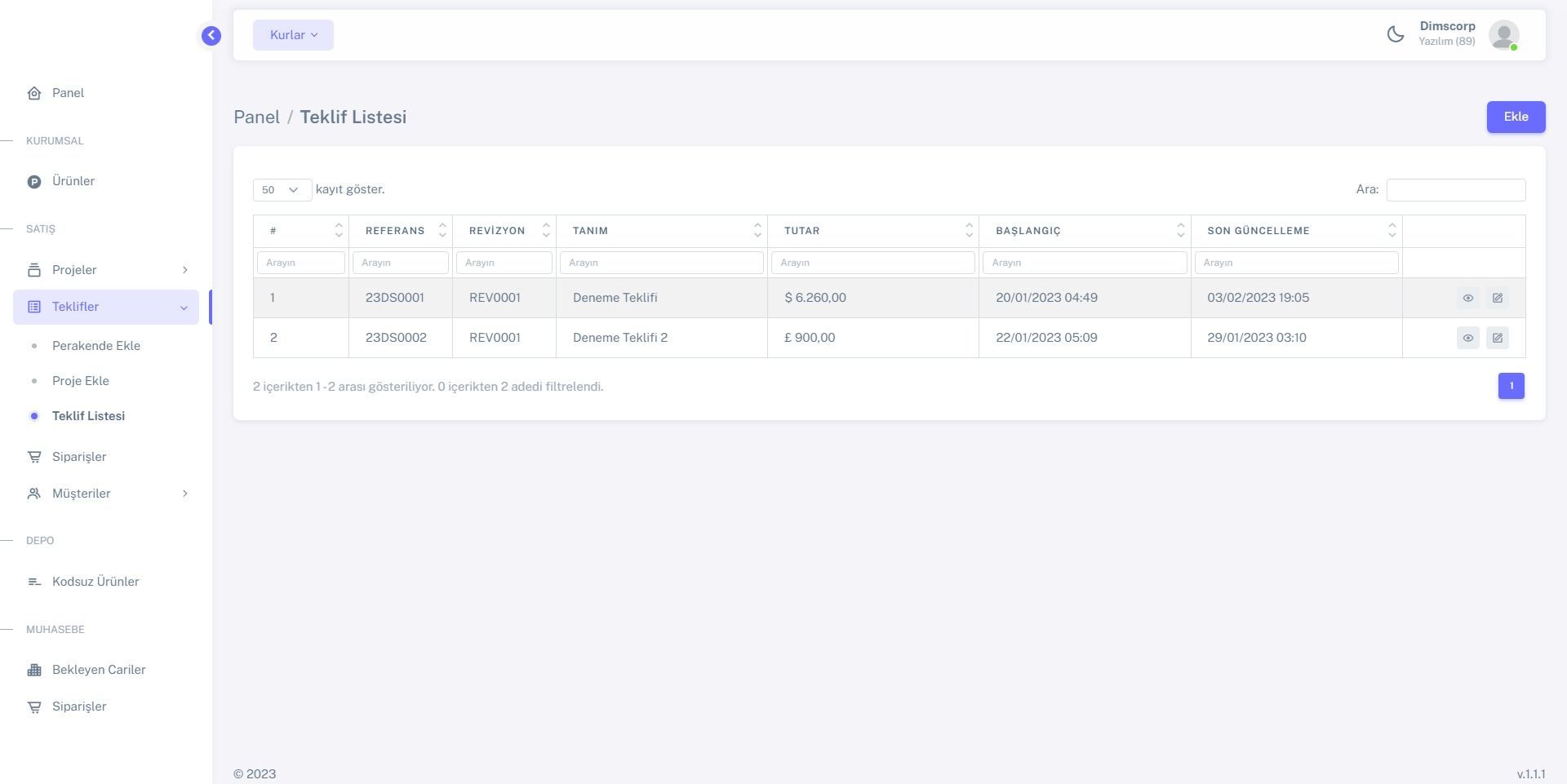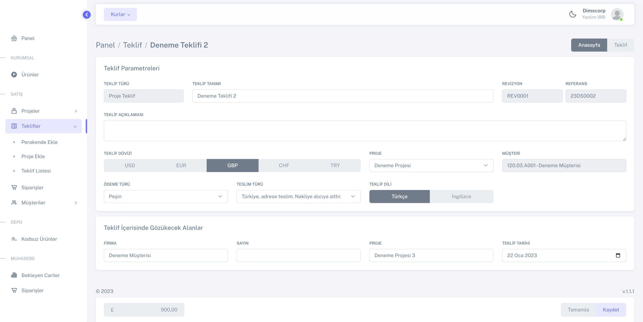 Teklif modülü ile müşterilerinize açtığınız proje kayıtlarını ürün listenizdeki ürünler ile tekliflendirebilirsiniz.